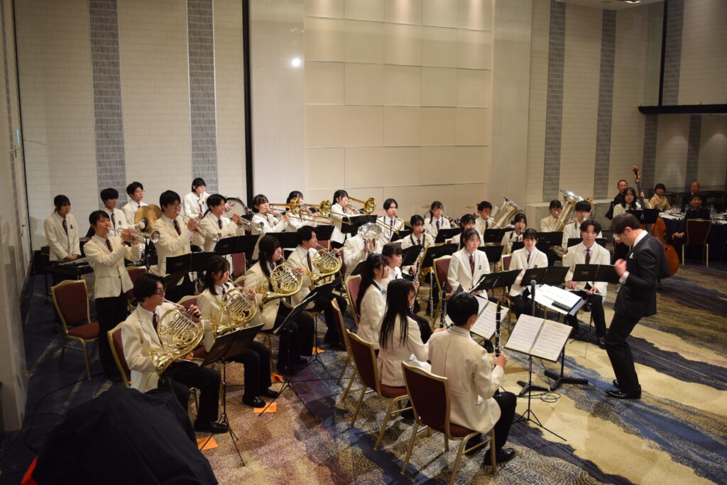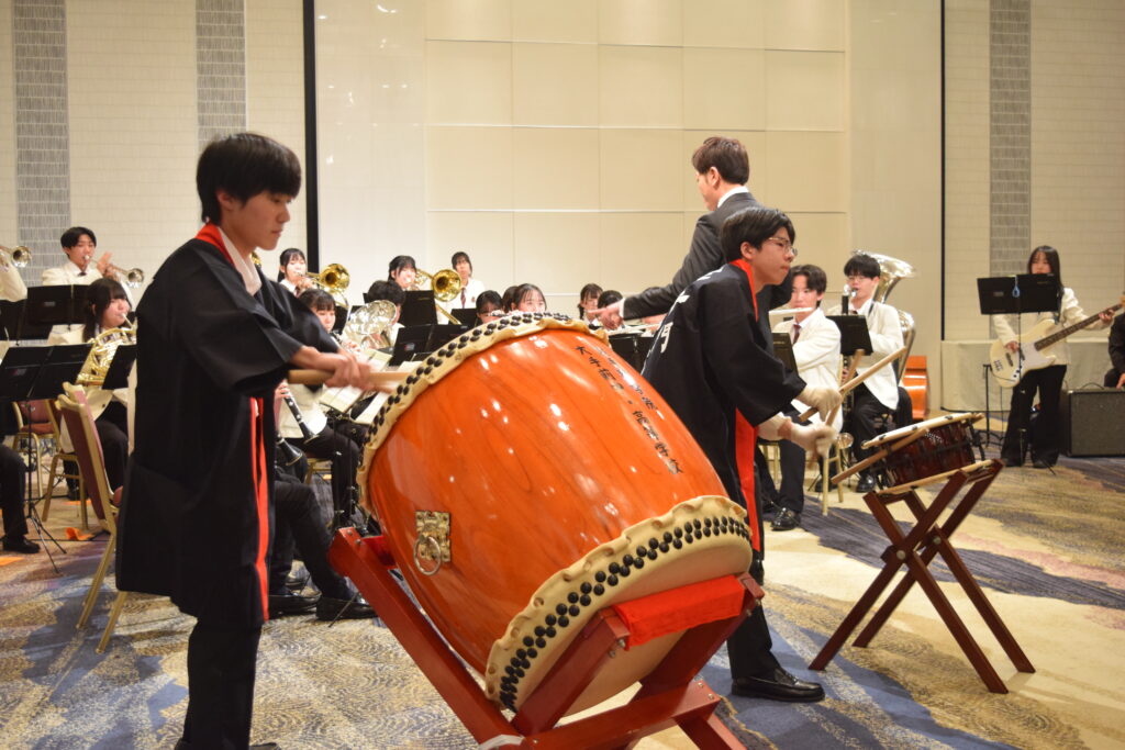 今年の新年会は「みんな集まろう!追手門」を掲げ、総合司会 松田真理子氏(小108期)の開会宣言、全員での国歌斉唱後に、様々なコンクールで数々の実績を残している大手前中・高等学校 吹奏楽部に華やかなで力強い演奏をご披露いただき、新年の幕開けにふさわしい輝かしいオープニングとなりました。吹奏楽部の募金には、ご参会の皆様よりたくさんの温かいご芳志をいただきました。心より感謝申し上げます。