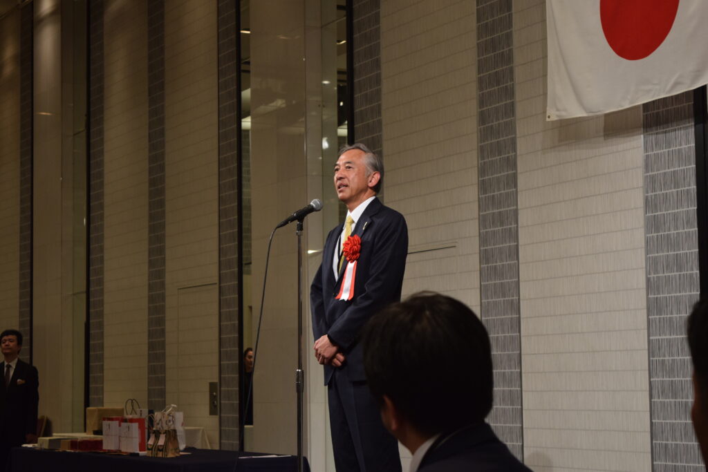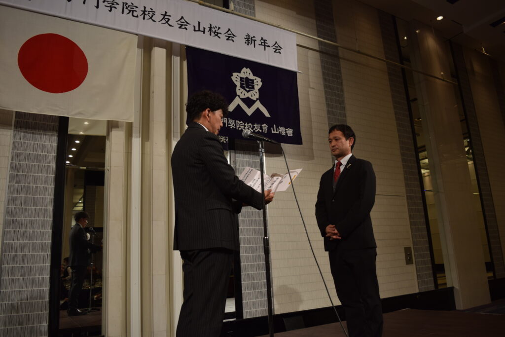 その後、林裕悟山桜会会長の挨拶、田口順一追手門学院理事長よりご祝辞をいただき、川原俊明山桜会顧問のご発声による乾杯で歓談が始まりました。同時開催の70歳同窓会のご出席者をご紹介させていただいた後は、全国高等学校アメリカンフットボール選手権大会で見事日本一になった追手門学院高等学校(茨木)アメリカンフットボール部の顧問 杤原優(くちはらまさる)先生より優勝報告と声援のお礼を頂戴し、また、山桜会から日本一となった功績を称えて、同クラブへお祝い金を贈呈いたしました。