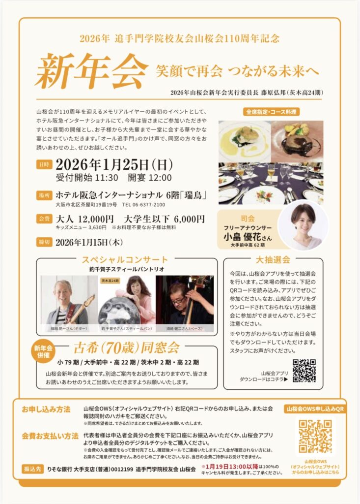 山桜会110周年を迎え、本年最初のイベントとして、ホテル阪急インターナショナルにて、今回はお昼の開催とし、女性の方や夜出ずらい方もご参加いただき、お子様から大先輩まで一堂に会する追手門ならではの催しです。「オール追手門」の掛け声で、同窓の方々お誘いあわせの上お越しくださいます様お願い致します。