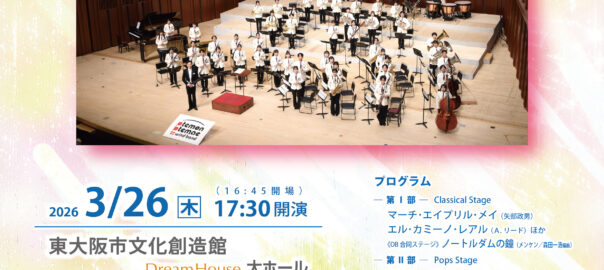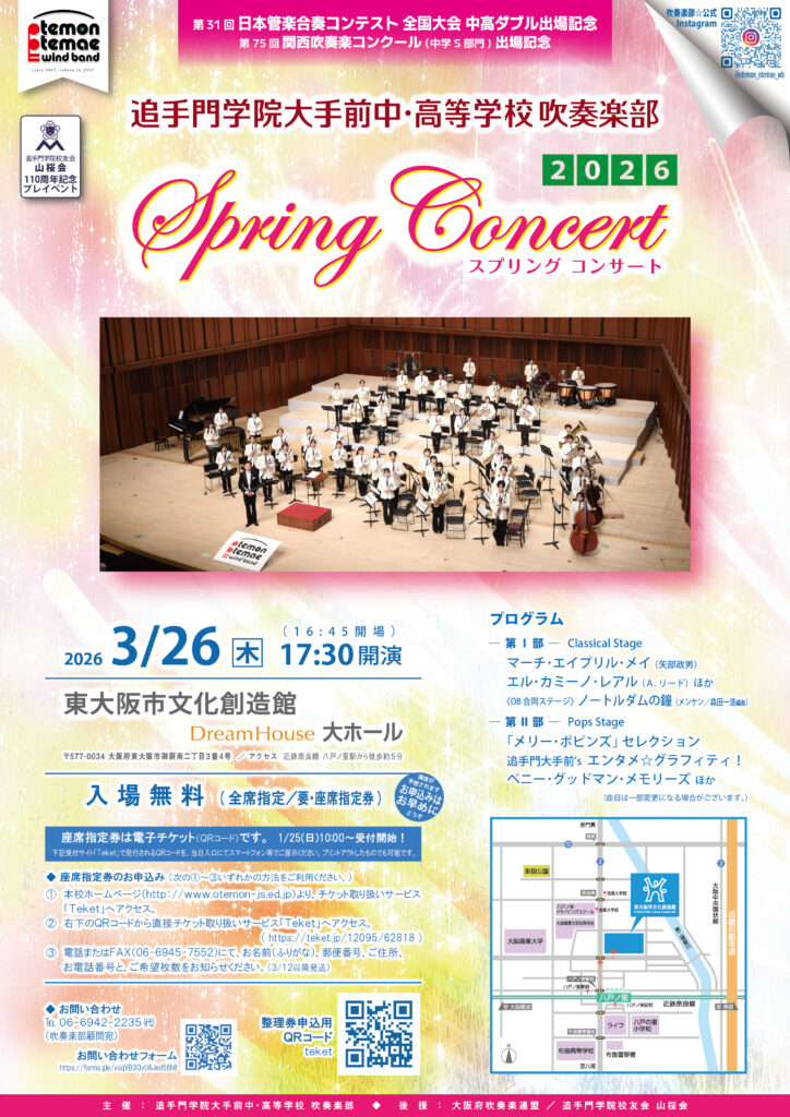 来たる3月26日(木)17:30より、東大阪市文化創造館Dream House大ホールにて開催されます大手前中高吹奏楽部によるスプリングコンサート2026に山桜会も後援させていただき、「山桜会110周年記念プレイベント」とさせていただくこととなりました。
